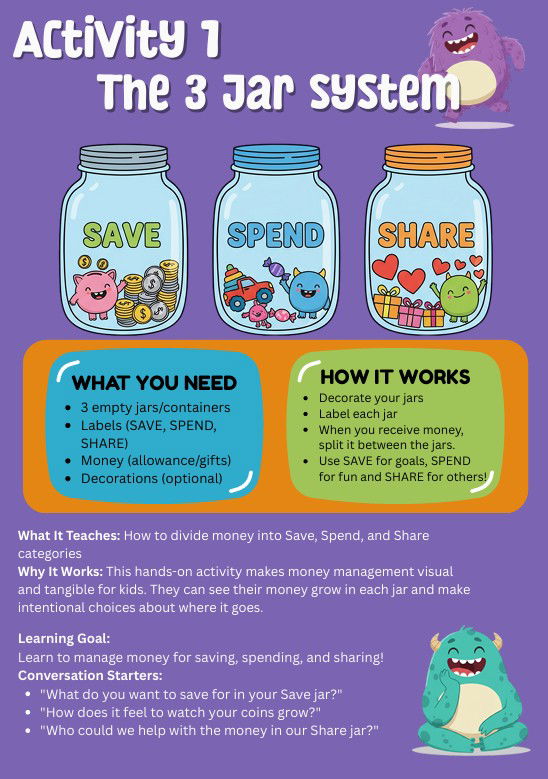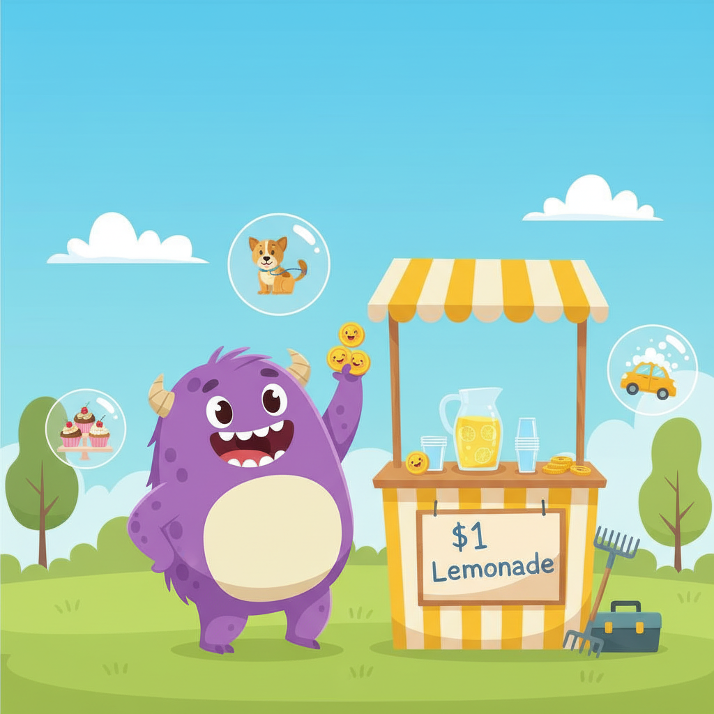 Buzz the Earner is an energetic purple fuzzy monster who loves working hard and earning money through creativity and effort. He's enthusiastic, hardworking, and teaches kids that earning money can be fun, rewarding, and empowering!